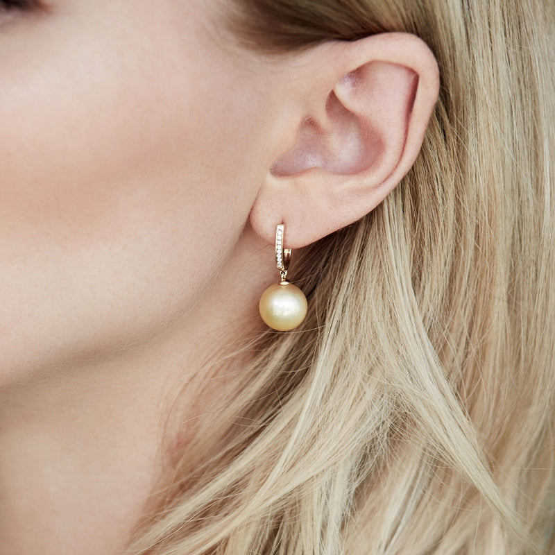 These stunning dangle earrings feature Golden South Sea pearls, hand-selected for their remarkable luster. You'll appreciate the elegance they bring, beautifully paired with 11 sparkling SI quality diamonds set in luxurious 18K gold. The design is both timeless and modern, making it perfect for any occasion—be it a night out in the city or a sophisticated gathering at home.