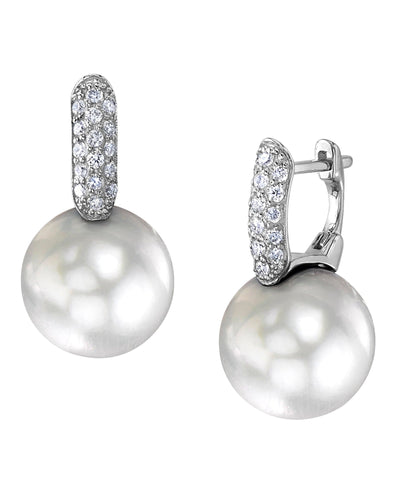 These stunning earrings feature two of Nature's most desirable treasures. Made with exquisite White South Sea pearls, they showcase luminous luster and smooth, clean surfaces. Each pearl measures between 10.0-11.0mm, placing them among the largest and rarest pearls in the world. The elegant design is complemented by solid 14K Gold Hoop style settings, adorned with approximately 0.24cttw of SI1 Quality diamond accents. You'll appreciate the sophistication and effortless grace they bring to any outfit.
