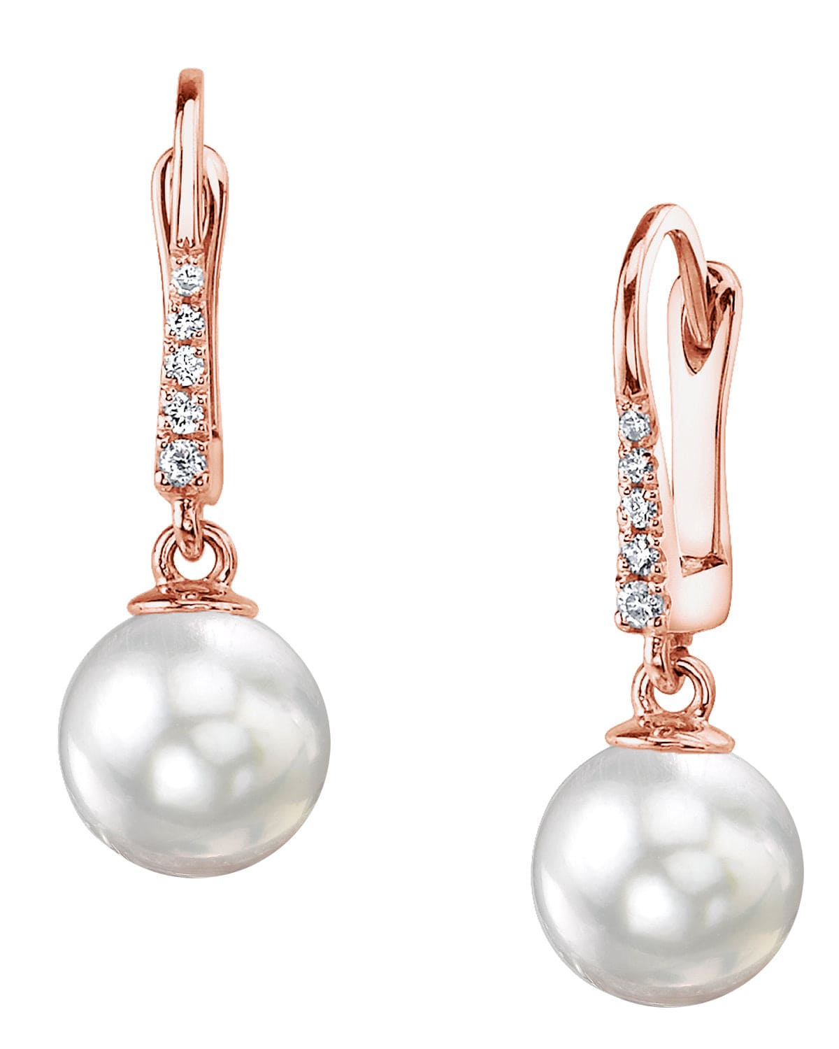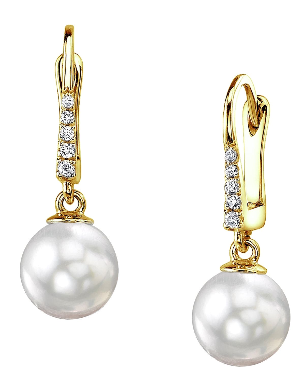 These stunning dangle earrings showcase two exquisite 9mm AAA White South Sea pearls. You'll appreciate their mirror luster that catches the light beautifully. Each pearl is thoughtfully handpicked to ensure it meets the highest standards. Set in fine 14K gold, the earrings are adorned with .10 carats of SI-quality diamonds, adding just the right amount of sparkle to elevate your look.